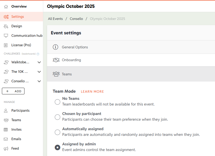 NOTE: This is an advanced feature. It should only be used if no team assignments have already been made, and once the majority of your users have already joined the challenge.