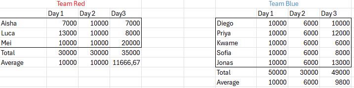 | Team Red | ✔️(10000) | ✔️(10000) | ✔️(11667) | 3 |