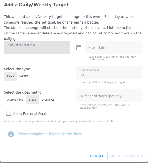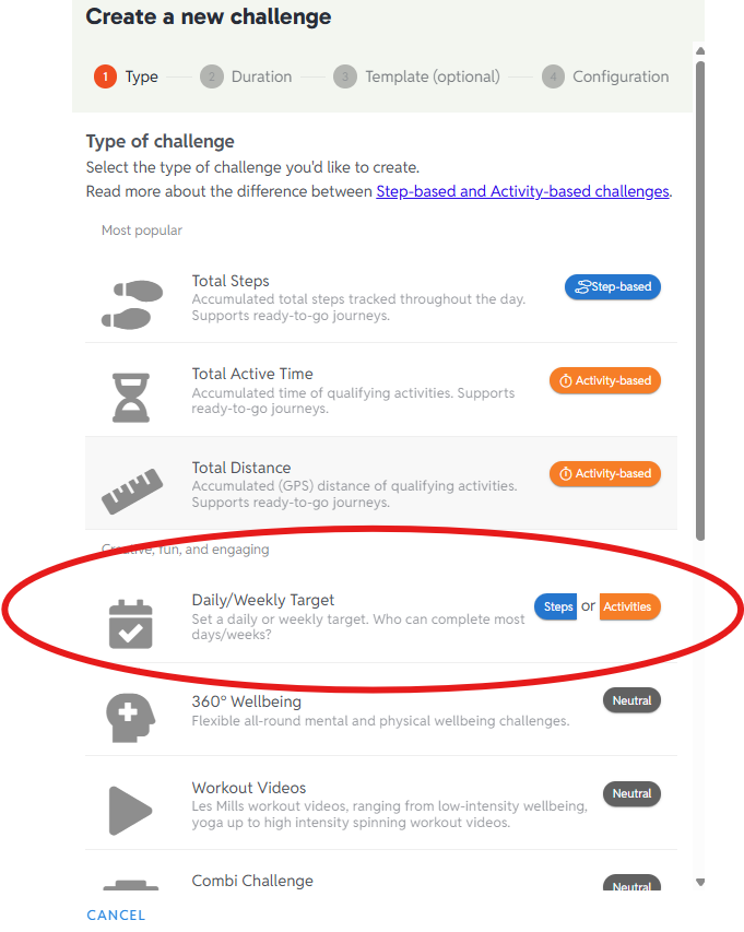 When creating a Daily Target challenge, an individual daily target leaderboard is created by default. You can create a team Daily Target challenge by following the instructions below.